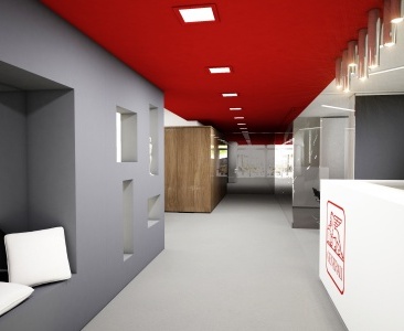L’intervento prevede il completamento della pavimentazione, della distribuzione interna, degli impianti, sia meccanici che elettrici e di tutto l’allestimento, con l’uso di pannelli-boiserie, controsoffitti per differenziare le aree operative, pareti in multistrato di vetro, arredi su misura e l’uso di corpi illuminanti a led a scomparsa totale, pavimentazioni superficiali in resina, al fine di offrire un ambiente accogliente con l’uso di pannelli lignei e al tempo stesso fresco ed attuale, utilizzando laccature a smalto all’acqua bianche e grigio medio.